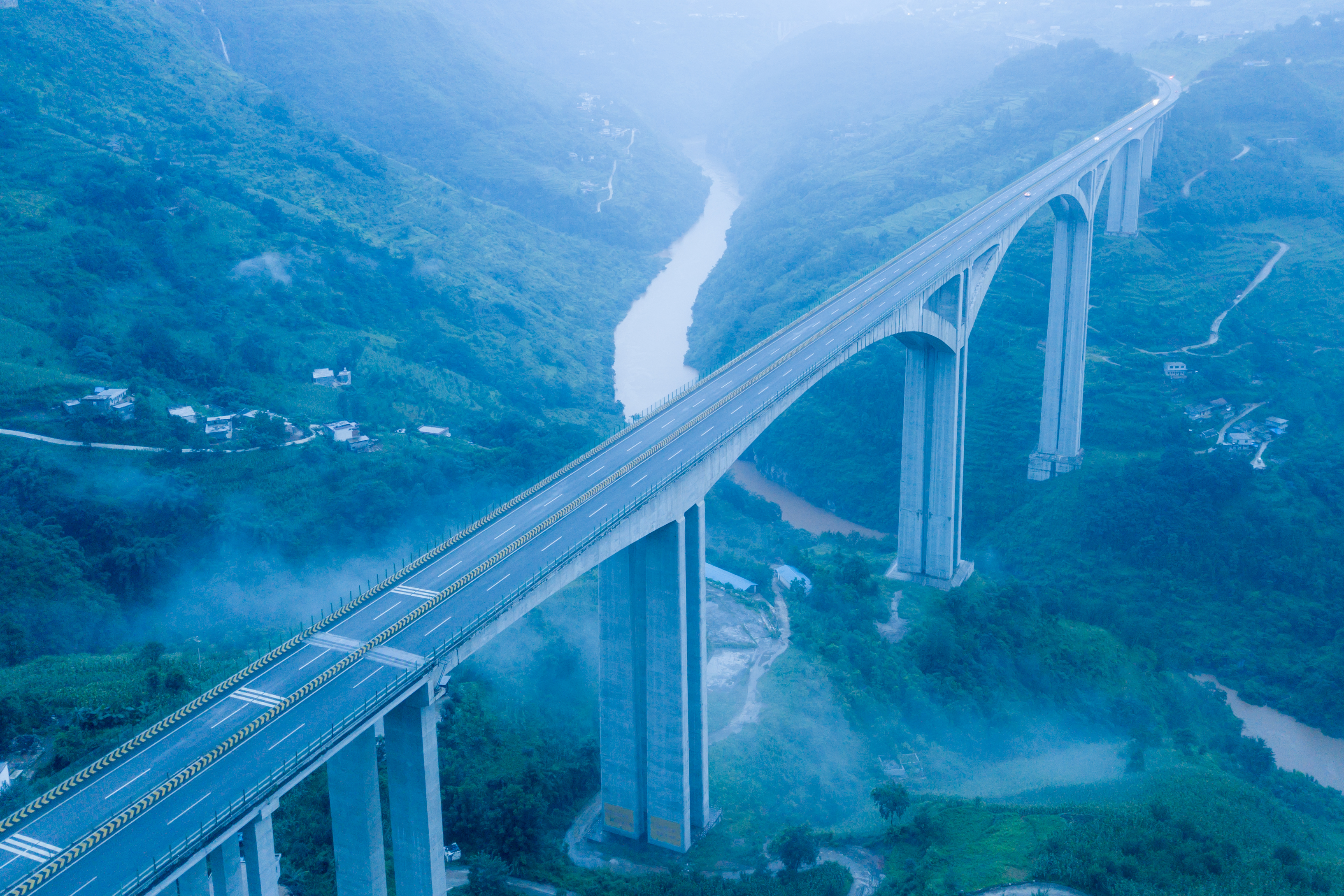 水盤高速公路北盤江特大橋全長1261m,主跨290m,是目前亞洲最大跨徑的預應力混凝土連續(空腹式)斜腿剛構,被譽為“世界第一腿”。其空腹式結構形式填補了跨徑在200~400m之間缺乏經濟適用橋型的空白;研發了“下弦采用斜爬掛籃結合臨時扣掛系統懸澆,上弦采用支架結合移動模架滯后下弦節段現澆”部級施工方法,并研制了大傾角、變曲率、可斜向行走的上置斜爬式掛籃國家發明專利。大橋于2013年8月16日建成通車。
