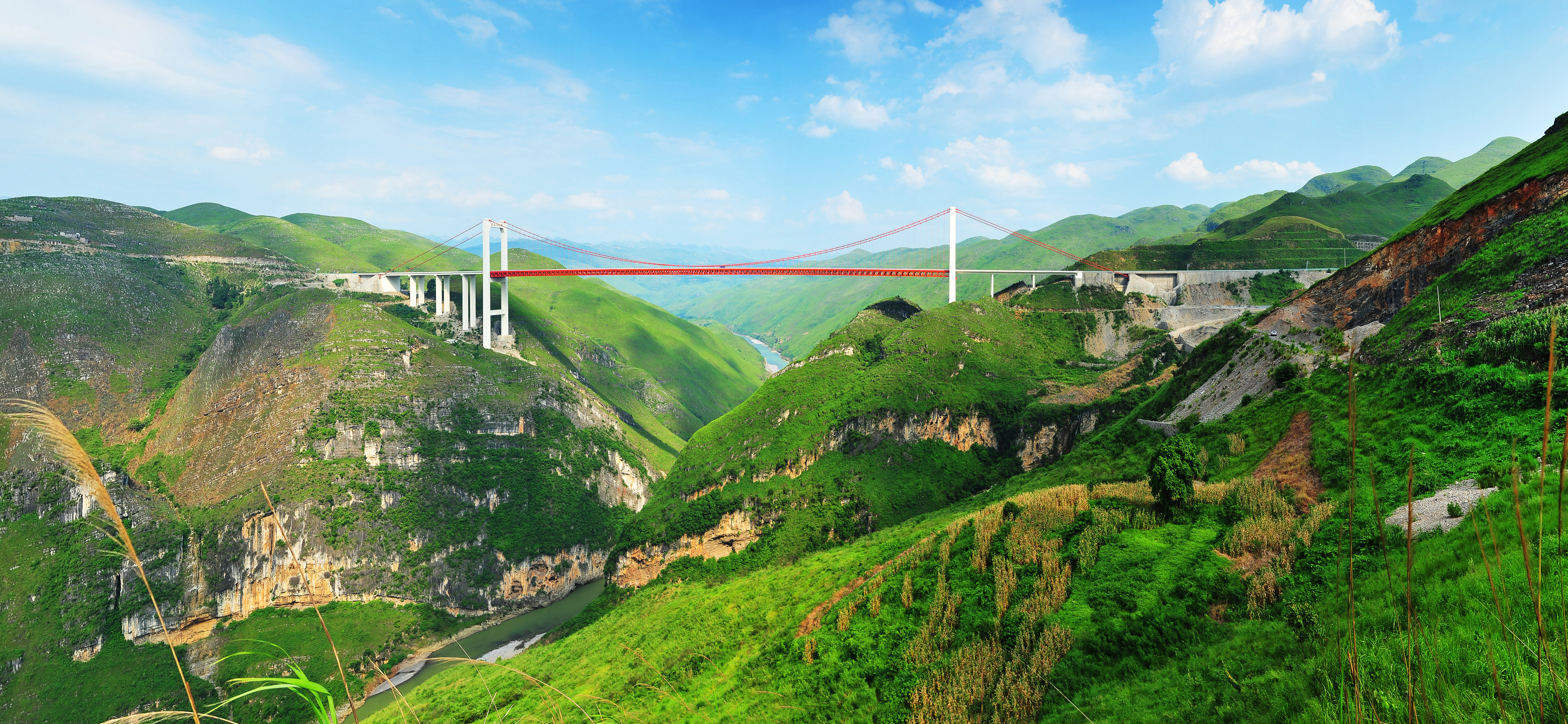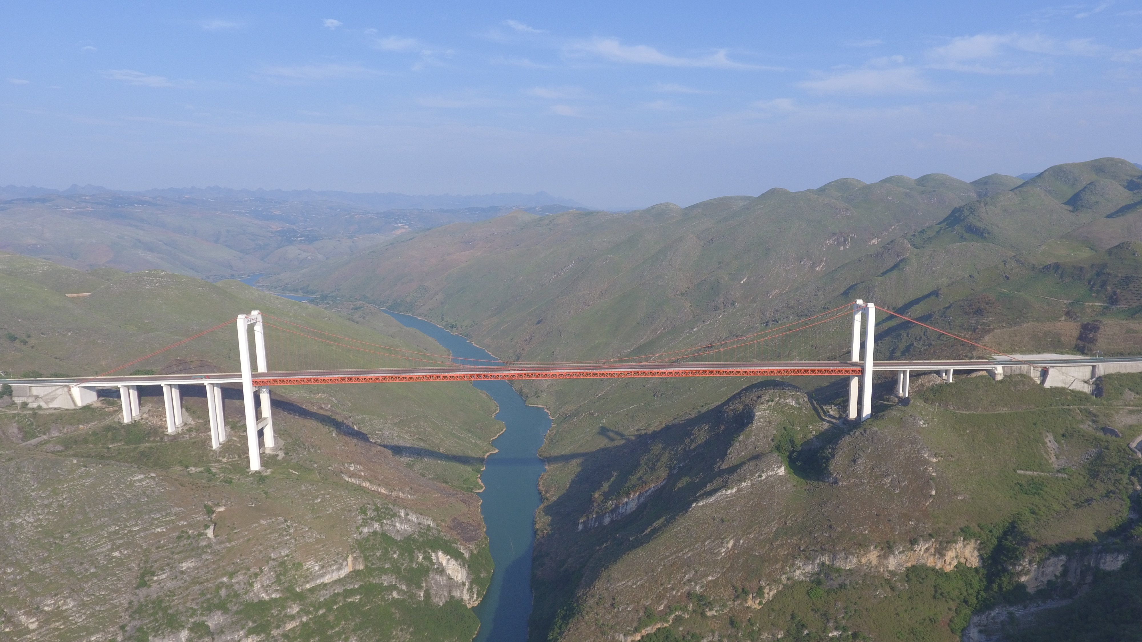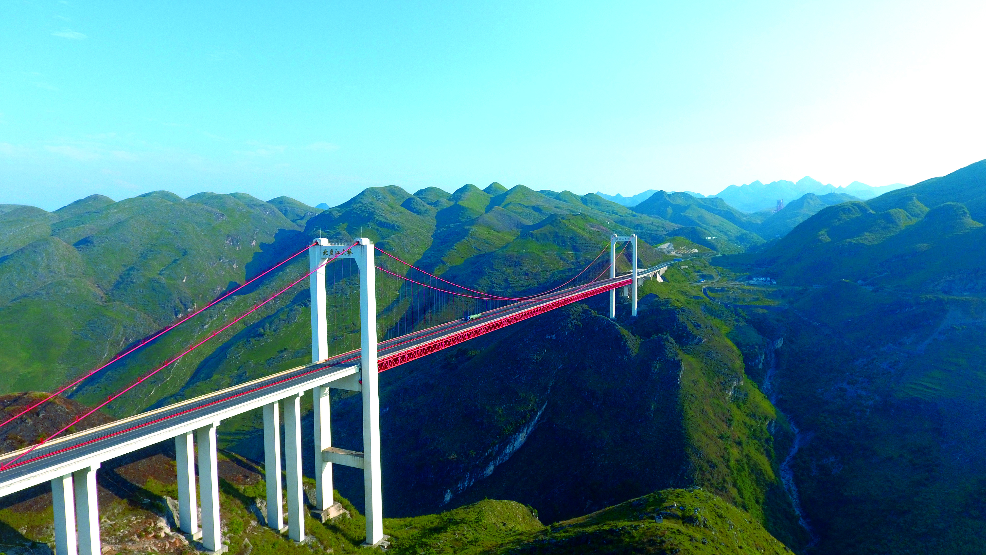 鎮勝高速公路北盤江特大橋,其主跨為636m單跨雙鉸鋼桁加勁梁懸索橋。主梁和橋面板安裝均采用纜索吊裝施工工藝,160T吊重和636m吊跨在建設時為國內之最,指引了千米級纜吊的設計與施工。大橋于2009年12月23日建成通車。
